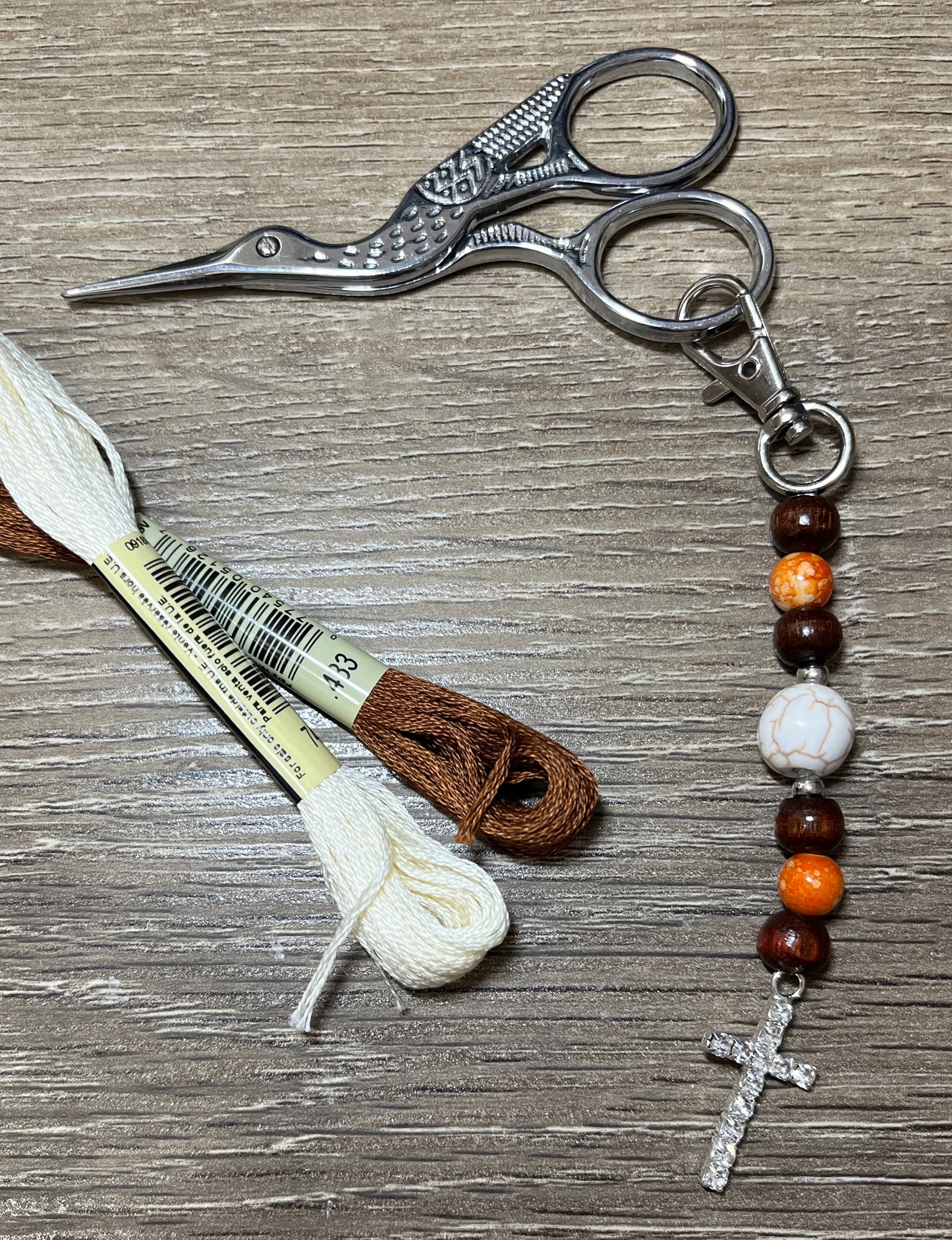 Our scissor fobs are a fantastic way to fancy up your scissors and scissor fobs also make finding your scissors easier. Complete with an assortment of beads & charms and also a large lobster clasp to fit most embroidery/cross stitch scissors.